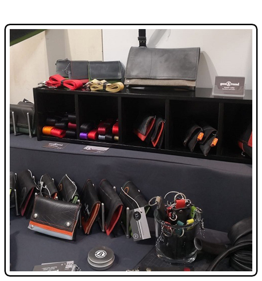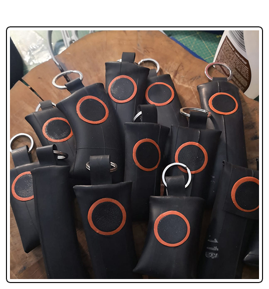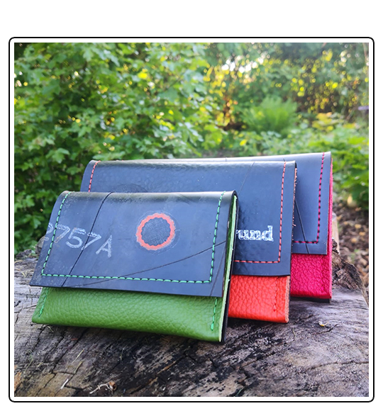 Die Gummiteile sind aus gebrauchten Schläuche von Traktor oder LKW Reifen. So wird aus gebrauch und robust, neu und robust. Mal mit Flicken oder Prägung, mal glatt. Ganß individuell. Manchmal habe ich auch nachträglich einen Flicken plaziert, da ist dann kein Loch dahinter. Alle anderen Materialien sind neu.